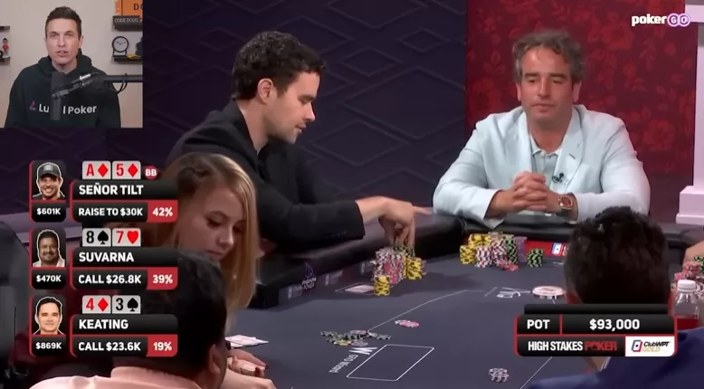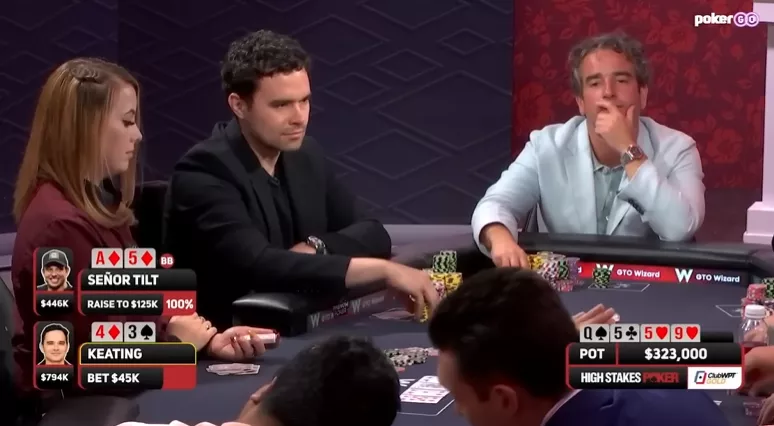 Сэм Кики или Сеньор Тилт ставит $30,000. Треть банка – стандартно на сухой доске против соперников, которые знамениты очень лузовой игрой на префлопе. Сантош выходит из розыгрыша, но Алан Китинг с 4-хай и бэкдорными стрит-дро строит большие планы. Он делает лузовый колл, и мы смотрим тёрн.