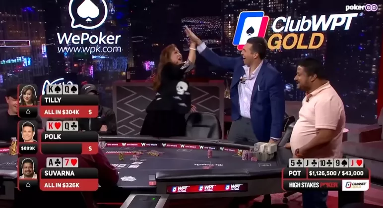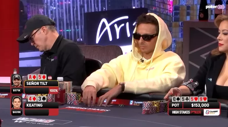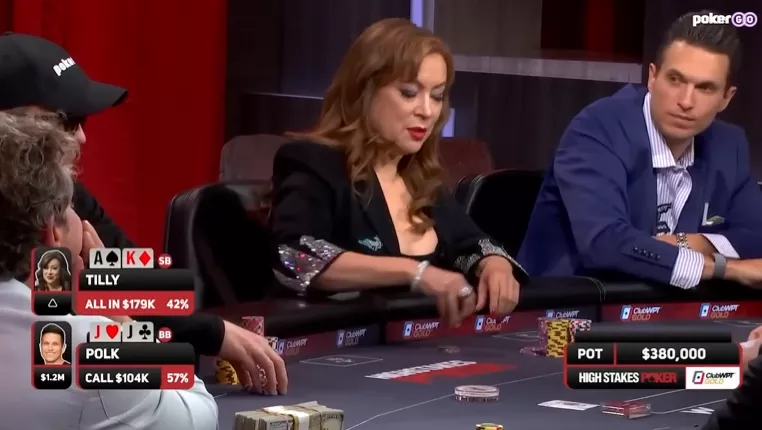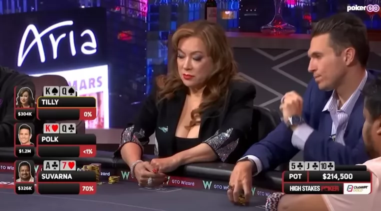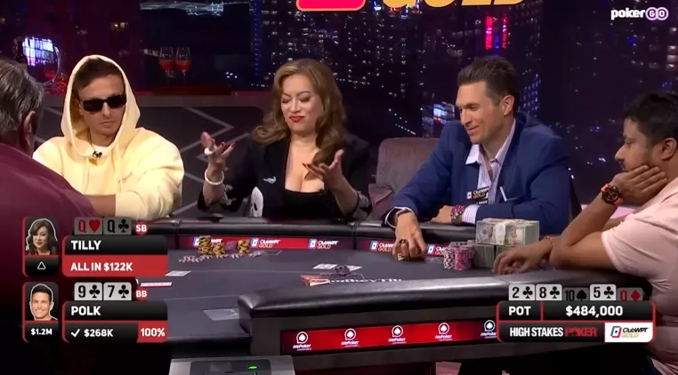 Тилли лидит $150,000 (мне кажется, за неё правильно чекать весь спектр). У меня очень простой олл-ин – просто много эквити. Сантош тоже пушит, и Тилли нужно принимать сложное решение со $154,000 за спиной.