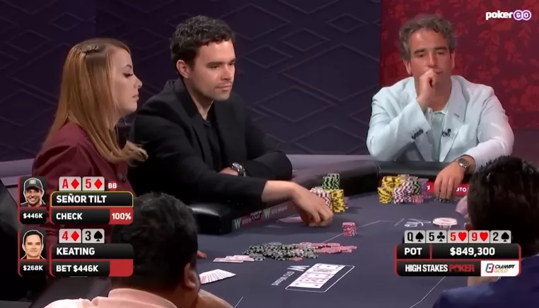 Дама, пять, пять, радуга! Флоп, будто созданный для экшена! Неудивительно, что этот банк превысил миллион долларов! Сеньор Тилт флопает трипс, все остальные флопают ничего.