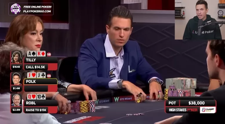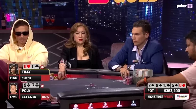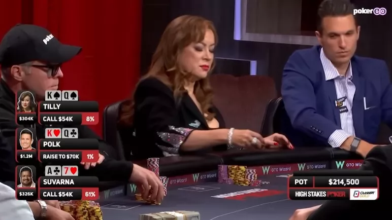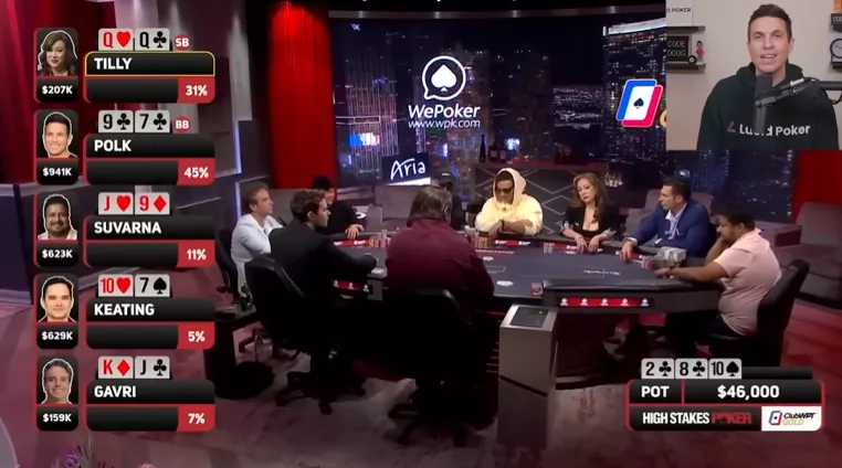 Тилли ставит контбет $10,000, шансы на успех которого равны нулю. Этот контбет напоминает мне о раздаче на одном из стримов из моего казино, в которой Джонни Вайбс решил поставить 3-бет с T7s, когда у трёх других игроков были дамы, короли и тузы.