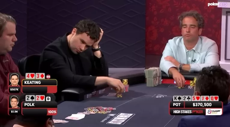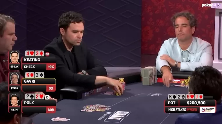 Сантош с двухсторонкой к стриту старше тоже делает колл. Китинг делает хороший фолд с топ-парой, Гаври выкидывает .