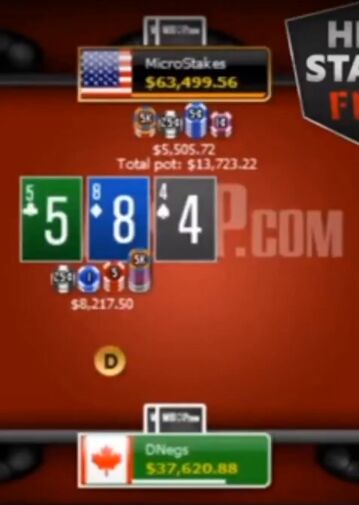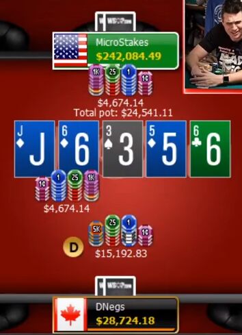 Как в такой ситуации поступать на месте Негреану, мне даже представить сложно. Скорее всего, учитывая, что в таком споте наша позиция уже практически не дает преимущества, надо просто широко ставить олл-ин уже на флопе.