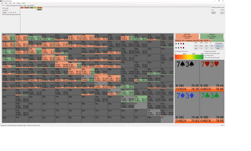 ...Надеюсь, вы его обдумали . Поделюсь своими мыслями, а потом обратимся к солверу. Во-первых, разномастная доска исключает флеш-дро, однако у нас остаются предпочтения по мастям. Блефовать всегда лучше с небэкдорными мастями, в данном случае, с червой, так как Даниэль чаще будет флоатить с бэкдорными флеш-дро и фолдить их на тёрне. Понятно, идеально иметь или , но одних гатшотов для баланса нам не хватит, нужно искать и другие блефы. Я бы в первую очередь рассматривал оверкарты к восьмёрке – , , , , предпочтительно с червой, но не критично.