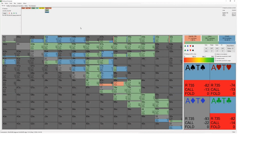 Все гатшоты, одномастные и разномастные, продолжают ставить с частотой 100%. Солвер также использует довольно много упомянутых мной оверкарт, но идёт дальше и добирает блефы за счёт А-хай – и . Солвер любит такие блефы, потому что они заставляют соперника фолдить и и при этом добирают против , , и .