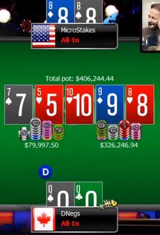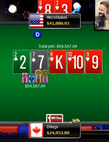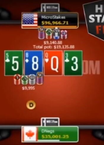 Колл Даниэля с наверняка делается с весом. Какие-то из должны коллировать. Для меня выбор между коллом и фолдом был бы трудным, но Даниэль заколлировал моментально. Возможно, у него был какой-то ридс.