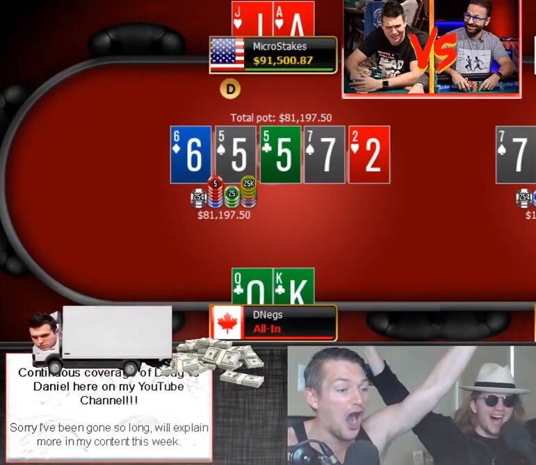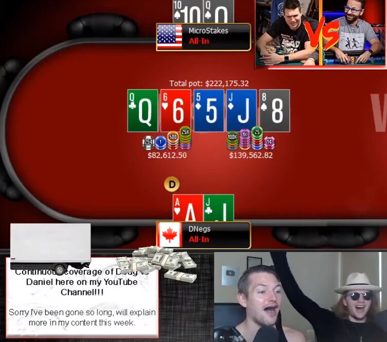 Тем временем на соседнем столе Даниэль ставит 5-бет-олл-ин на префлопе, и Даг быстро фолдит.