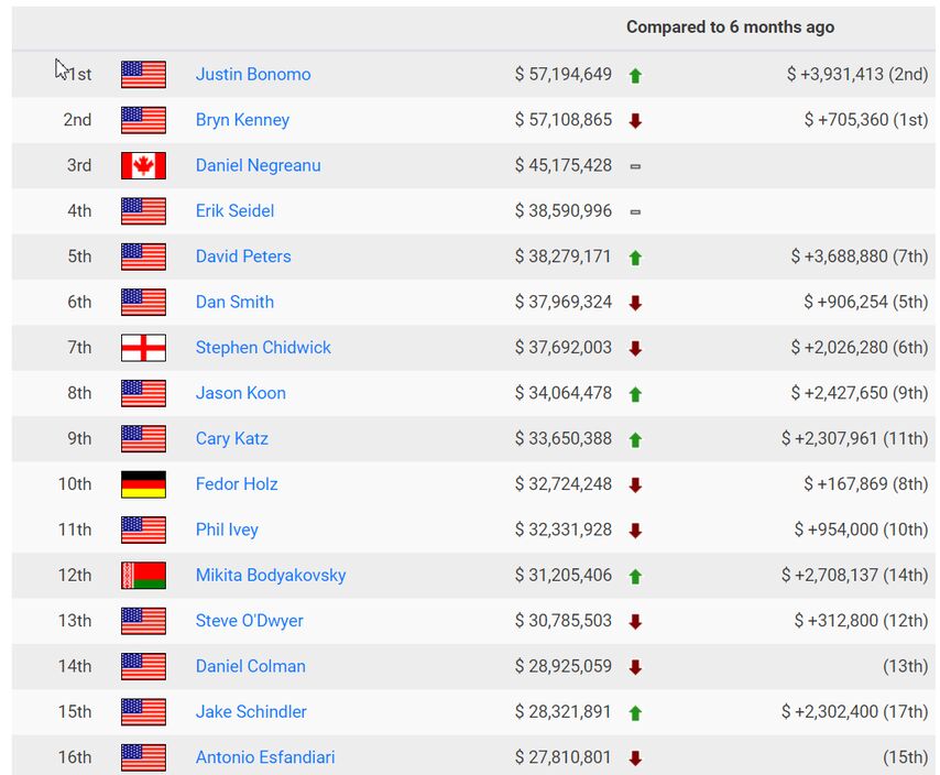 Цифры приведенные ниже — из официальных источников. Им можно верить. Однако это далеко не полная сумма призовых каждого из игроков в покер. Скорее всего, это лишь вершина айсберга, но об этом можно только догадываться. Также нужно иметь в виду, что многие игроки продают доли и платят налоги — а значит, получают не полные суммы выигрышей.