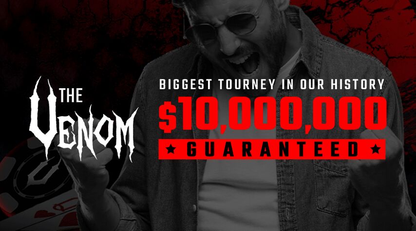 2. Турнир The Venom с гарантированным призовым фондом $10,000,000. Знаменитый флагманский турнир ПокерКинга проходит несколько раз в год, делая миллионерами все новых счастливчиков. Бай-ин в него позволит себе не каждый — $2,650. Но не обязательно платить всю сумму: можно отбираться через многоступенчатые сателлиты, которые стартуют с фрироллов.