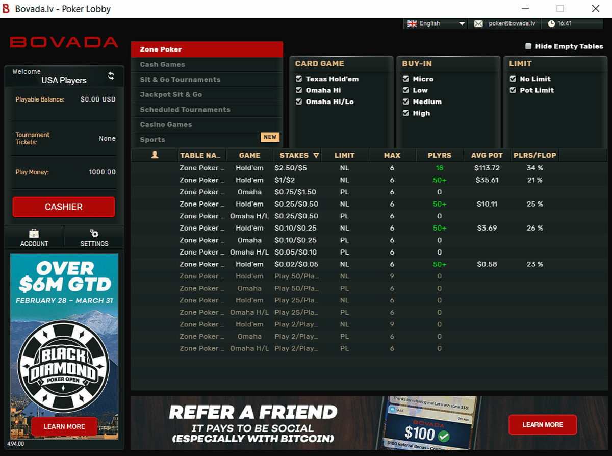 При игре с ПК вы сможете открыть до 4 окон одновременно. Полноценно выбирать кэш-столы нельзя. Игрок задает формат стола, вид покера и желаемый лимит. Рум сажает клиента за подходящий по параметрам стол. Bovada Poker работает на операционных системах Windows и MacOS.