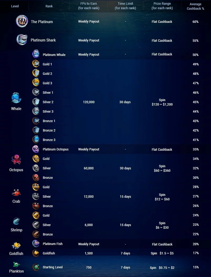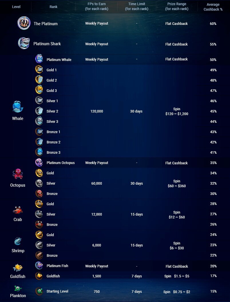 Расчет рейкбека происходит с помощью программы лояльности Fish Buffet. За уплаченный за столами рейк приходят очки FP по схеме «одно очко за каждые $0.01». Новый статус позволяет увеличивать процент рейкбека.