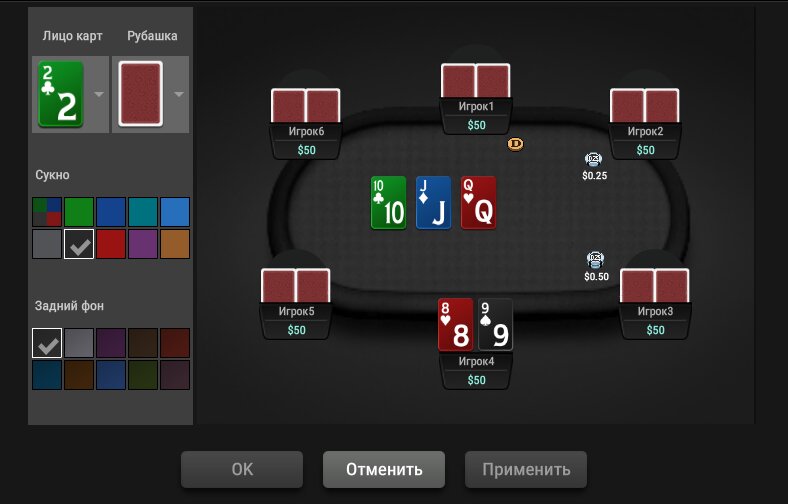 Помимо этого, присутствуют стандартные опции современного покерного клиента: можно изменить оформление стола, карт и фишек, включить автодокупку в кэш-играх, установить значения ставок по умолчанию, отображать стеки в больших блайндах.