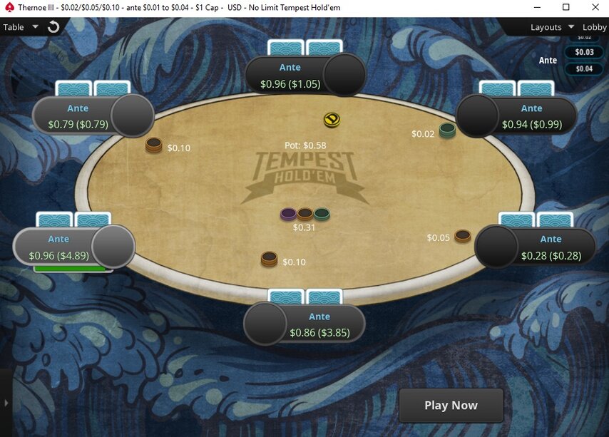 Лимиты от $0.01/$0.02 до $200/$400 на 2, 6 и 9 человек. Доступны холдем, омаха, стад, дро-игры и другие разновидности. Есть столы с анте, глубокими и короткими стеками/ Быстрый покер ZOOM заканчивается на $2.5/$5.