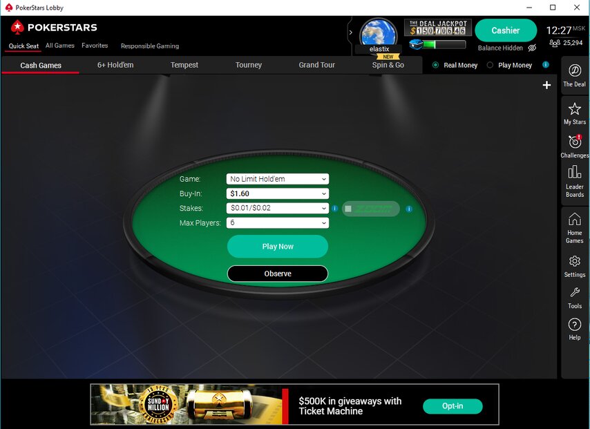 Клиент PokerStars можно скачать на официальном сайте. На выбор версия для операционных систем Windows и macOS. Интерфейс интуитивно понятный: игры разбиты по вкладкам в верхней части лобби. Можно искать конкретные столы и подбирать оппонентов или воспользоваться меню Quick Seat, где достаточно выбрать уровень ставок и игру.