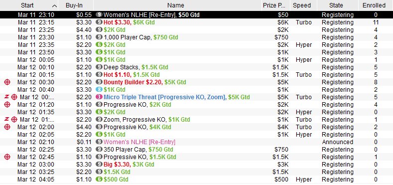 Разные типы турниров в лобби отличаются цветами для сортировки. Например, красным выделены ежедневные Hot, Big, Bounty Builder, а фиолетовым — турниры только для женщин.