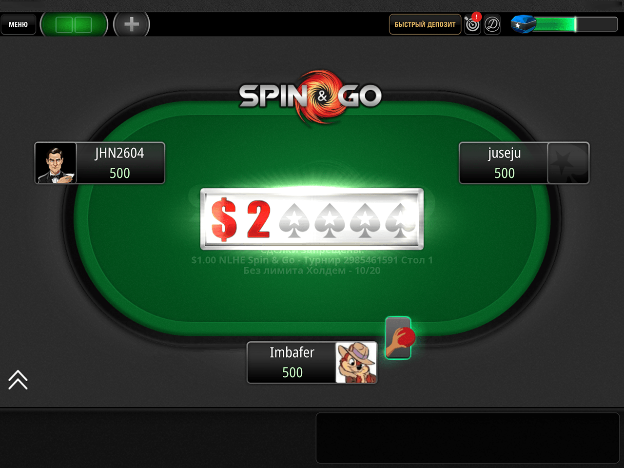 Популярный формат гипер-турбо Sit and Go со случайным призовым фондом назвали Spin and Go. Трое участников, бай-ины от $0.25 до $1,000. Максимальный приз — $1,000,000. Начальный стек в спинах — 500 фишек. Продолжительность уровня зависит от множителя.
