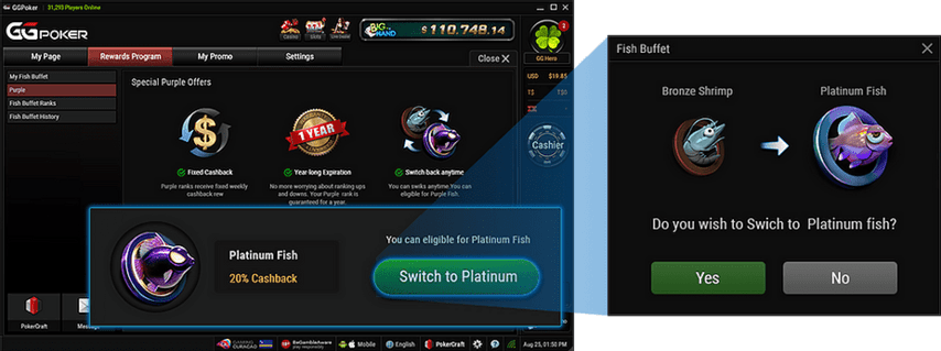 - Platinum Fish: 20% рейкбек, для перехода нужен статус Bronze Shrimp или выше.