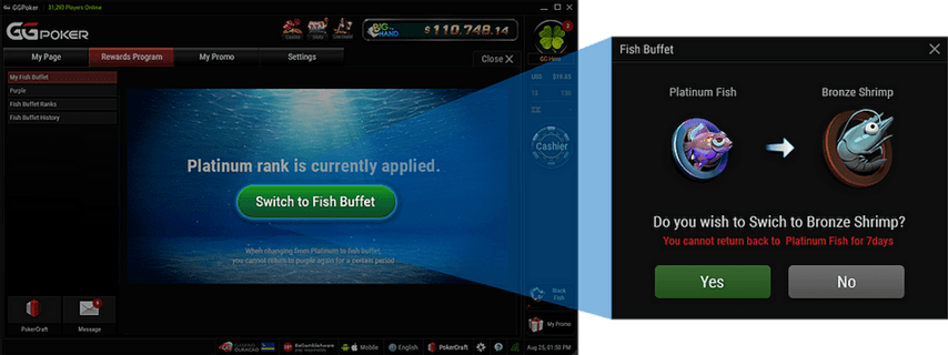 При переходе выплачиваются все неполученные награды, FP обнуляются. Для возврата к статусу Platinum нужно выдержать паузу, равную количеству времени для получения статуса. Например, если вы перешли из Platinum Fish к Bronze Shrimp, перейти обратно можно только через 15 дней.