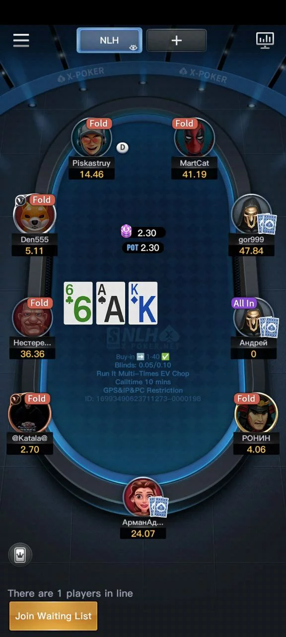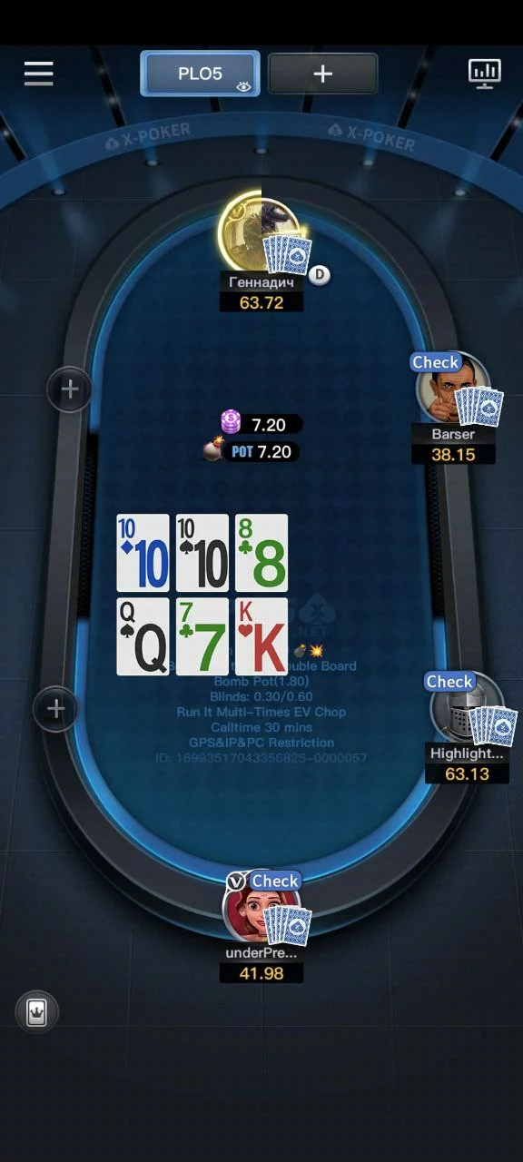 Во многих клубах X-Poker игра стартует с лимитов NL10/PLO10. Поэтому мобильный рум подойдет даже начинающим покеристам с небольшим банкроллом. Самый высокий спрос тут на безлимитный техасский холдем и несколько разновидностей омахи. В некоторых клубах есть шорт дек и китайский покер. В большинстве закрытых сообществ самый востребованный лимит — это NL20. Почти везде вы найдете 5-6 активных столов по таким ставкам. Пик трафика приходится на вечерние часы по Москве.